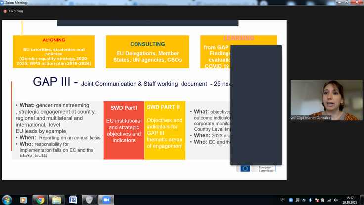 Webinari u hap nga znj.Olga Martinez Gonsales, e cila është pikë fokale gjinore në DG NEAR në Komisionin Evropian. Ajo shpjegoi Planin e Veprimit Gjinor III (PVGJ) të BE-së dhe përkushtimin e tij për buxhetimin e përgjigjshëm gjinor. Ajo theksoi se, dokumenti përbëhet nga pesë shtylla - angazhimi i BE-së për barazi gjinore, angazhimi strategjik i BE-së, gjashtë fusha kryesore për angazhim, BE udhëheq përmes shembullit dhe shtylla e llogaridhënies.