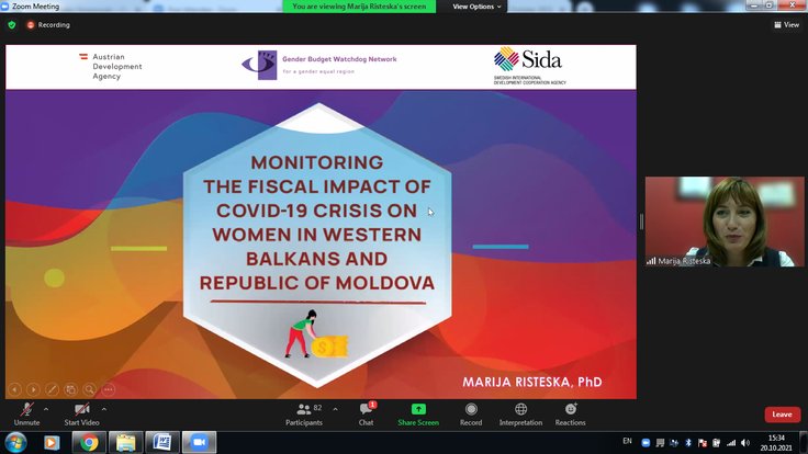 Risteska prezantoi gjetjet kryesore të monitorimit të ndikimit fiskal të Covid-19 tek gratë në Ballkanin Perëndimor dhe Republikën e Moldavisë. Ajo tha se, janë vënë re sfida dhe problematika serioze në plotësimin e nevojave të grave dhe burrave të ndryshëm, në pothuajse të gjitha fushat e hulumtuara – afati kohor i përgjigjes, përgjegjshmëria gjinore e buxhetit (masat fiskale për përgjigja ndaj COVID-19), transparenca e procesit të reagimit ndaj Covid-19, llogaridhënia për përgjigjen ndaj Covid-19 dhe ndikimi tek gratë, si dhe ndikimi i masave fiskale gjinore të Covid-19. Ajo gjithashtu u përqëndrua në rekomandimet për përmirësimin e situatës së evidentuar si, më shumë mbështetje për gratë sipërmarrëse, platforma dixhitale dhe rrjetëzim, në mënyrë që gratë të kenë qasje më të mirë në financa. Ajo foli për kriteret gjinore në mbështetjen buxhetore dhe paketat e rimëkëmbjes të ofruara nga BE si kërkesë për miratimin e tyre, etj.