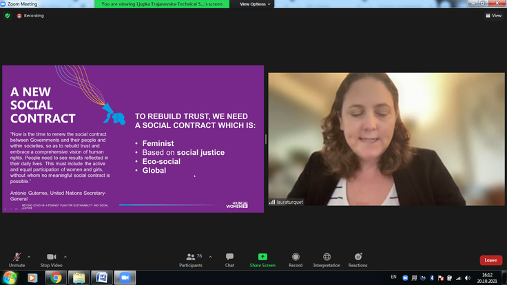 Folësja e rradhës ishte znj. Laura Turquet -Këshilltare e Politikave të UN Women dhe nënkryetare e ekipit të hulumtimit dhe të dhënave. Ajo shtjelloi “Planin feminist” për qëndrueshmëri dhe drejtësi sociale. Znj. Turquet theksoi se më shumë se 54 mil. gra kanë humbur punën e tyre në dy vitet e fundit dhe se sektori i kujdesit vazhdon të mbetet shumë i papaguar. Një çështje serioze është fakti që gratë mbeten të papërfaqësuara në ekipet e grupit të punës në të gjithë botën, kështu që një kontratë e re sociale, e bazuar në feminizëm, drejtësi sociale dhe ekologji është mëse e nevojshme.