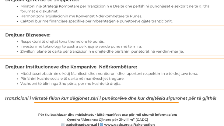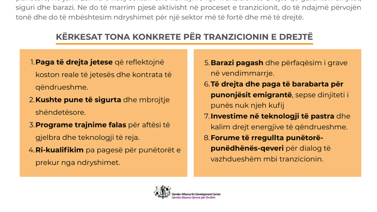 ✊ Ky manifest është një thirrje drejtuar Qeverisë, bizneseve dhe kompanive ndërkombëtare për të vepruar, për të respektuar dinjitetin e punës dhe për të garantuar që kalimi drejt ekonomisë së gjelbër të mos lërë askënd pas.