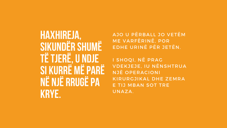 Punonjësit e fasonerisë në vend, ishin ndër më të prekurit nga pandemia Covid-19. Si për të mos mjaftuar rroga e ulët për mundin e derdhur, një pjesë e mirë e fasonerive e dërguan krahun punëtor në shtëpi, me qëllim shmangien e pagesës në fundmuaj, duke ndikuar kështu drejtpërdrejtë në shtrirje të skamjes. Haxhireja, sikundër shumë të tjerë, u ndje si kurrë më parë në një rrugë pa krye. Ajo u përball jo vetëm me varfërinë, por edhe urinë për jetën. I shoqi, në prag vdekjeje, iu nënshtrua një operacioni kirurgjikal dhe zemra e tij mban sot tre unaza. Jo më kot ky çift i sprovuar mendon se u është dhënë një jetë e dytë për t’u jetuar, pavarësisht grishjeve të vazhdueshme të shpirtit. E megjithatë, mendimet e këtilla- shpresa për një të ardhme më të mirë-janë të vështira për t’u mbajtur gjallë, për sa kohë shtrohet urgjenca e mbijetesës në kushte dhe të ardhura minimale. Haxhires i duhet gjithashtu të marrë ilaçet e të shoqit pa rimbursim, pasi ende nuk i ka dalë pensioni i invaliditetit. E si mund të mos legjitimohen të sajat lëvizje gjymtyrësh?! Ajo po i ofrohet tokës, këmbë e duar bashkë; pak nga mosha dhe pak nga dhimbja.